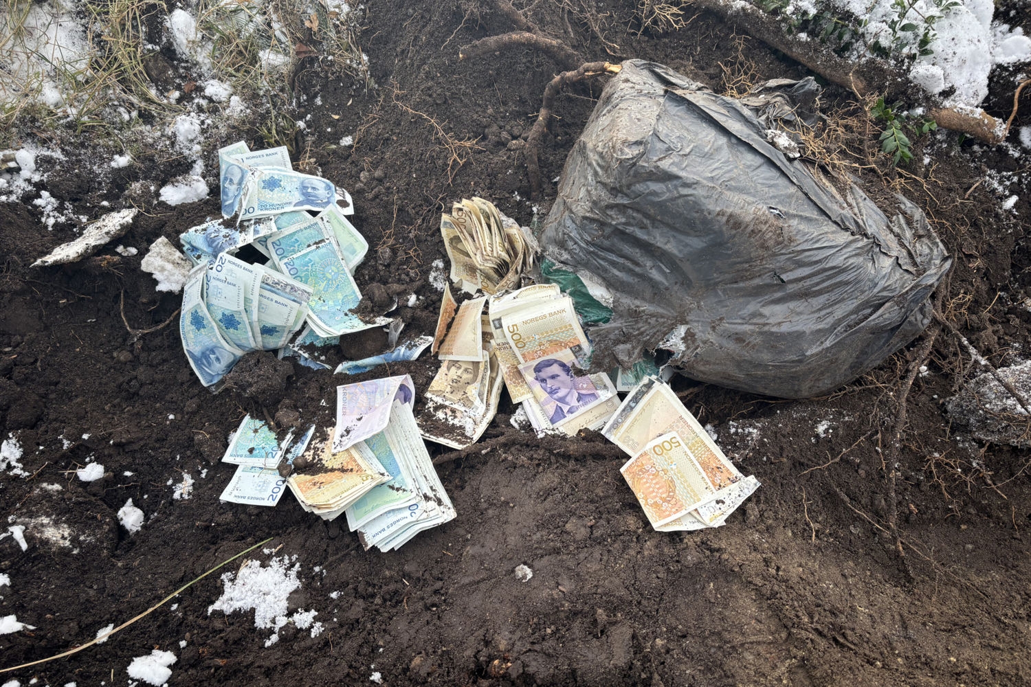 Arbeiderne stanset alt arbeid da de oppdaget de nedgravde pengene og ringte umiddelbart til politiet, som hentet pengesekken. Arbeiderne stanset alt arbeid da de oppdaget de nedgravde pengene og ringte umiddelbart til politiet, som hentet pengesekken. Foto: Politiet / NTB
